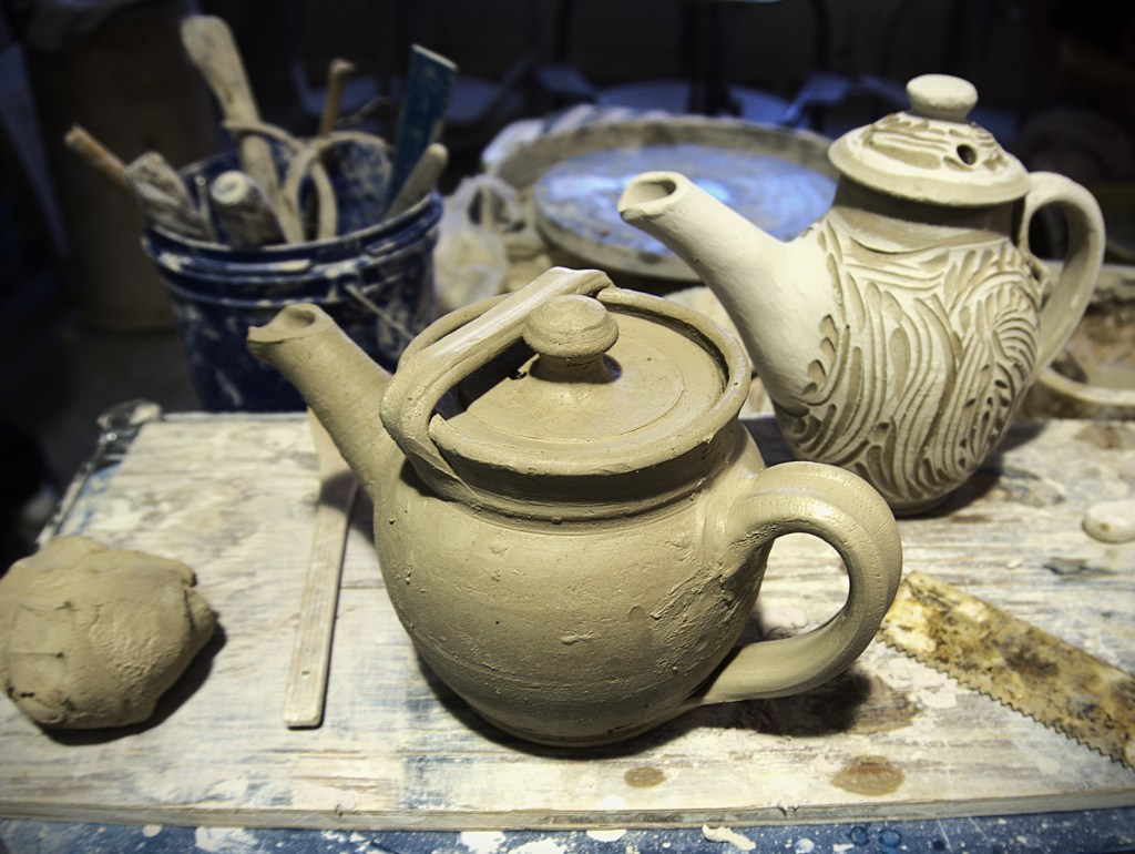 Some new teapots in Process: this is in the green-ware stage prior to smoothing out some of the surface blemishes from handling while putting the parts together. The wo types of lids are both thrown off the hump, one flat, one domed thrown upside-down with the knob added later. The domed lidded teapot is carved through white slip. To make a teapot work, I follow the steps in Michael Cardew’s Pioneer Potter book. My style is different but I try to make sure my teapots work. The domed one has a flange which catches when pouring. The strap catches the flat lid.