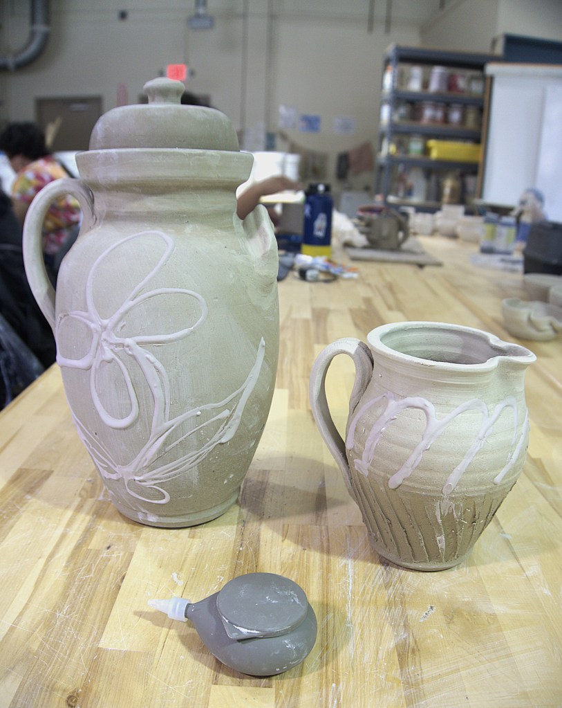 I quit trying slip trailing until recently because I never found a tool that suited my practice. When a student asked me to demonstrate a traditional pickling jar, I thought it was the best candidate to test this cake decorating tool I got from HEB clearance. There is a doubled wall gally where the lid rests for a water seal. There is a small drain to be plugged with a piece of waxed wood. I got this from looking at a DX Gordy, large jar in the Westville pottery. The student showed me a contemporary version from the internet. I think this was around 8-10 lbs. The Gordy version probably took 25lbs, which is what I used to use to make churns and other larger pieces, close to my limit. I still used the collar technique for joining 2 wet parts which I learned also from DX when he revisited Westville.